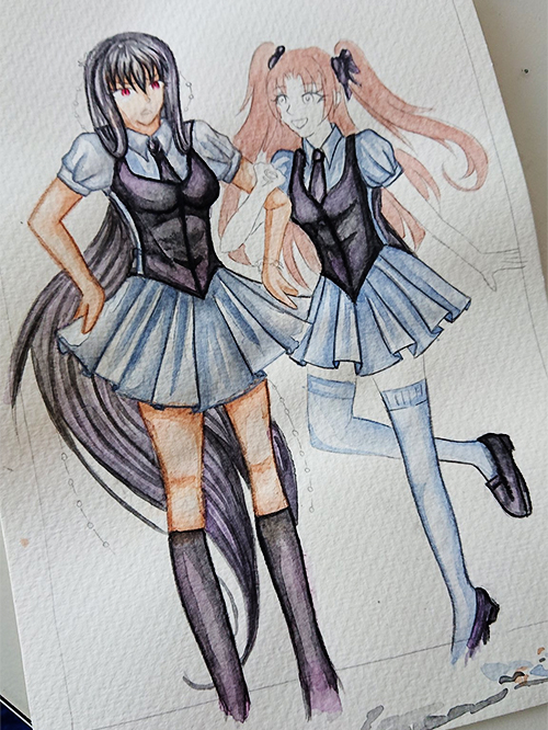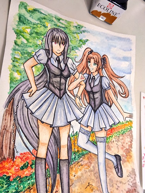 Kommentar des Künstlers, Yuuka: Dieses Bild entstand Speziell für Momo! Darauf unsere RPG Charaktere Yami (Links) und Miu (Rechts) in ihrer Akadame Uniform. Yami jedoch trägt diese das erste mal und ist davon nicht besonders begeistert. Das Bild entstand als Kritzelei zum Spaß aber irgendwie hatte ich Lust daraus ein Aquarell-Artwork zu machen. Ursprünglich mit Bleistift Outlines, aber irgendwie hatte mir das ganze doch nicht so sehr gefallen.... Daher wurden es dann nachträglich noch Copic Lines. Mehr gibt es dazu nicht zu sagen. Ich hoffe es gefällt! |