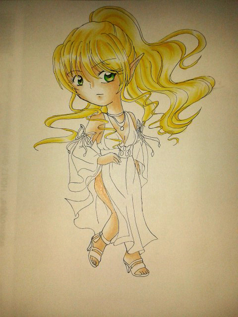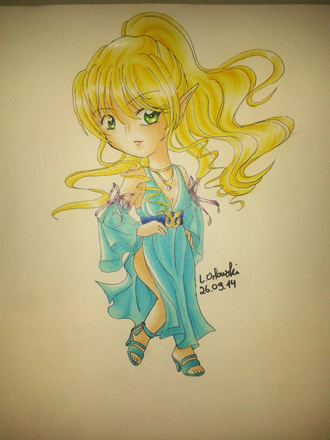 Kommentar des Künstlers, Rhapsody: Ein kleiner spontaner Chibi, den ich aus Jucks und Dollerei gezeichnet habe als ich gerade wieder Spaß an meiner Geschichte Seelenfalter hatte. Lustigerweise war das das erste Farbbild meines Charakters Vanora. Es hat sehr viel Spaß gemacht das Kleidchen zu designen und zu colorieren, auch wenn mir ihre Haare zu knallig sind. Ich brauche unbedingt blassere Gelbtöne. |