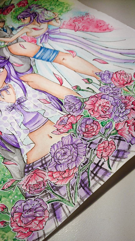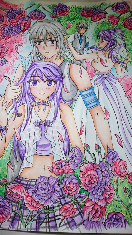 Kommentar des Künstlers, Yuuka: Dieses Bild entstand Ursprünglich für einen Zeichen Wettbewerb von Egmond. Als Thema war - Zauber der Liebe - vorgeschrieben. Ich wollte etwas unglaublich aufwendiges auf das Papier bringen und dabei wichtige Aspekte meines Liebeslebens widerspiegeln. dazu gehören der OC von mir und meinem Ehemann wodurch wir uns überhaupt erst kennenlernten, so wie unsere Hochzeit letztes Jahr im Sommer. Ich finde das eine Hochzeit das zauberhaftes Erlebnis einer Beziehung ist und daher Erwähnenswert. Das ganze ist Farblich sehr an den Frühling angepasst und soll eine helle, fröhliche Ausstrahlung haben. Leider hat es zu keiner Platzierung gereicht, dennoch habe ich das Bild unglaublich gern! |