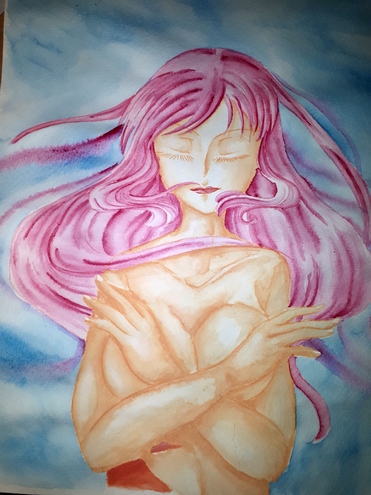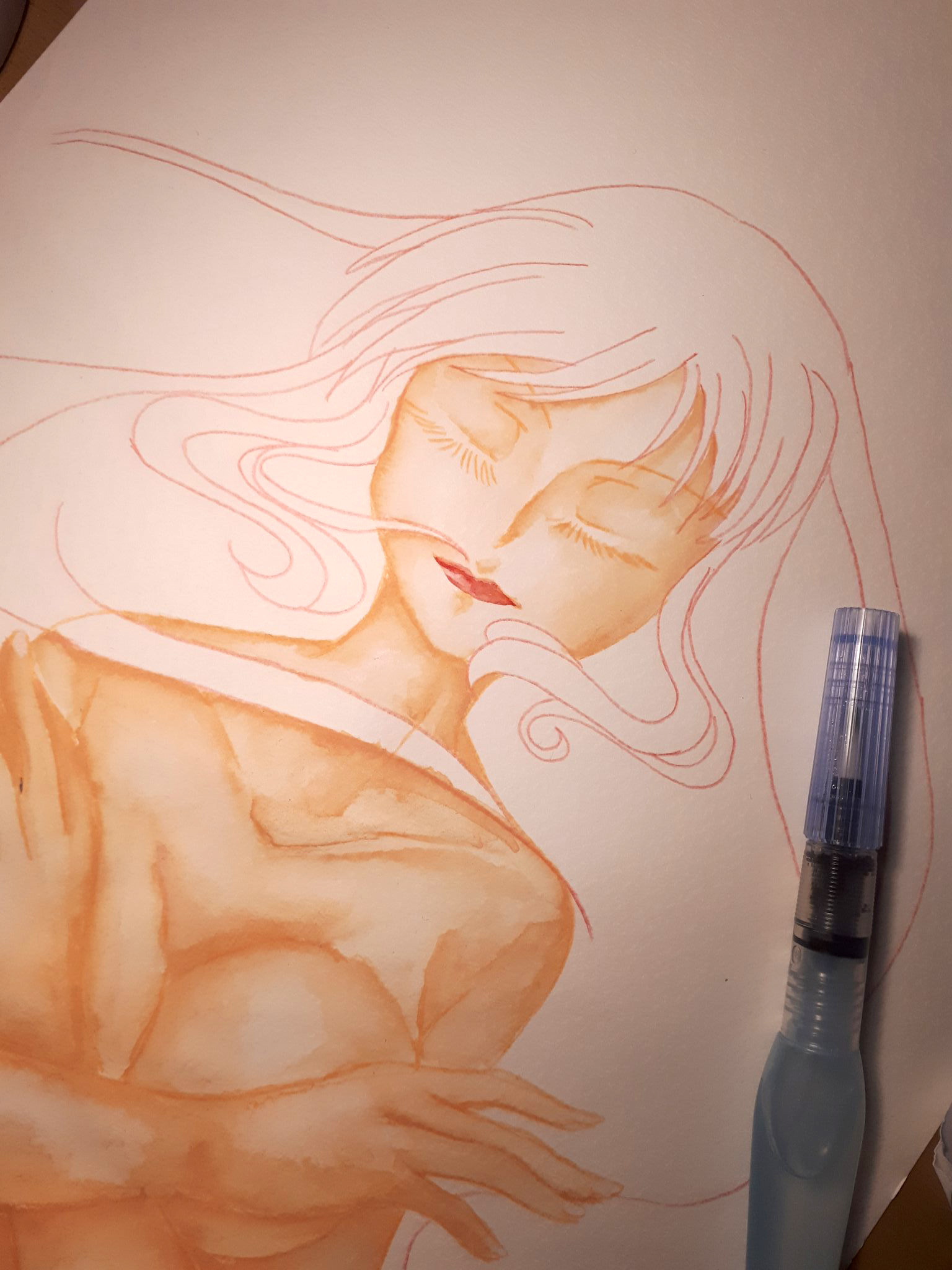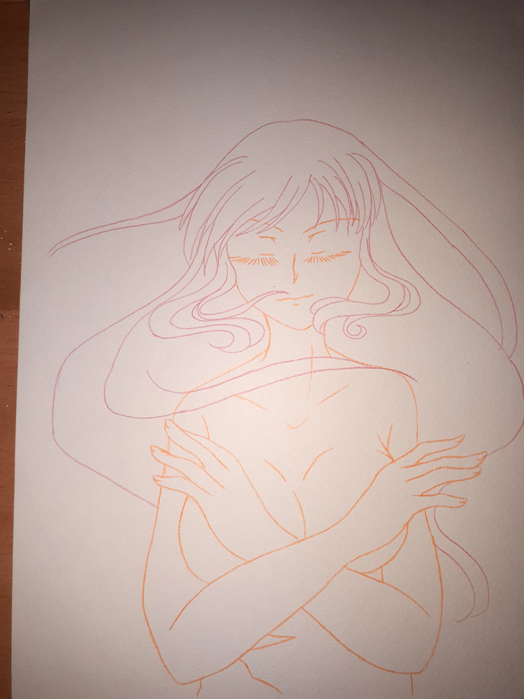 Kommentar des Künstlers, Rhapsody: Die Idee für dieses Bild kam mir spontan, als mir meine Schwester von einem Video erzählte, das sie geschaut hatte. Daraufhin wollte ich unbedingt ein Bild zeichnen, bei dem die Haare mit dem Hintergrund verlaufen - und somit war zumindest das Material zur Coloration schon klar. Und da ich ohnehin noch ein hübsches Bild von Amila wollte (und Lust auf Nacktbilder hatte haha), nutzte ich die Idee direkt für sie. Die Coloration hat mir wirklich sehr viel Spaß gemacht, nicht zuletzt weil ich hier auch sehr viele kleinere Details einbauen konnte, die sonst mit Copics beispielsweise sehr schwer sind. Für die Outlines verwendete ich hier die neu gekauften Buntstifte, die ich unbedingt testen wollte. |