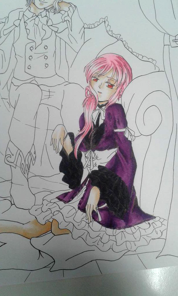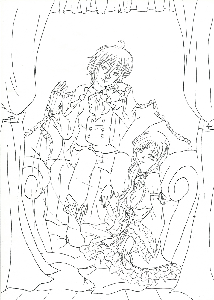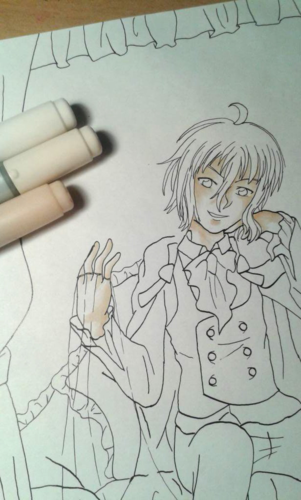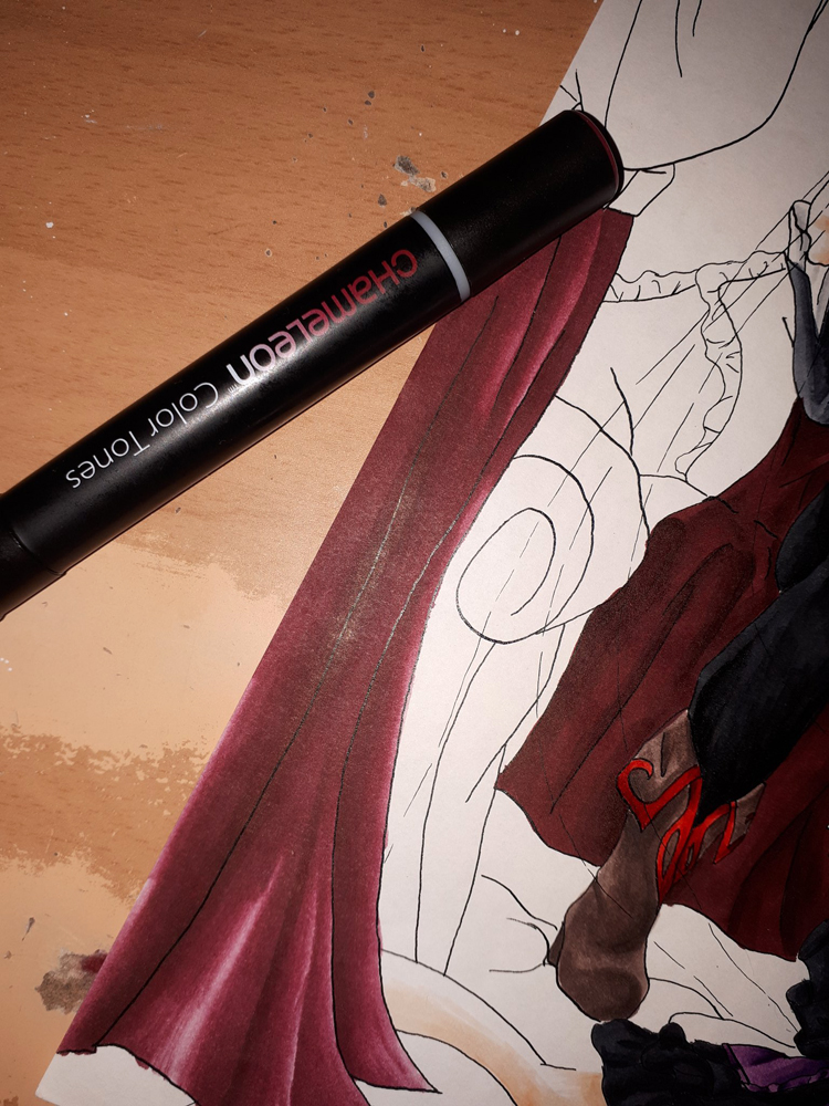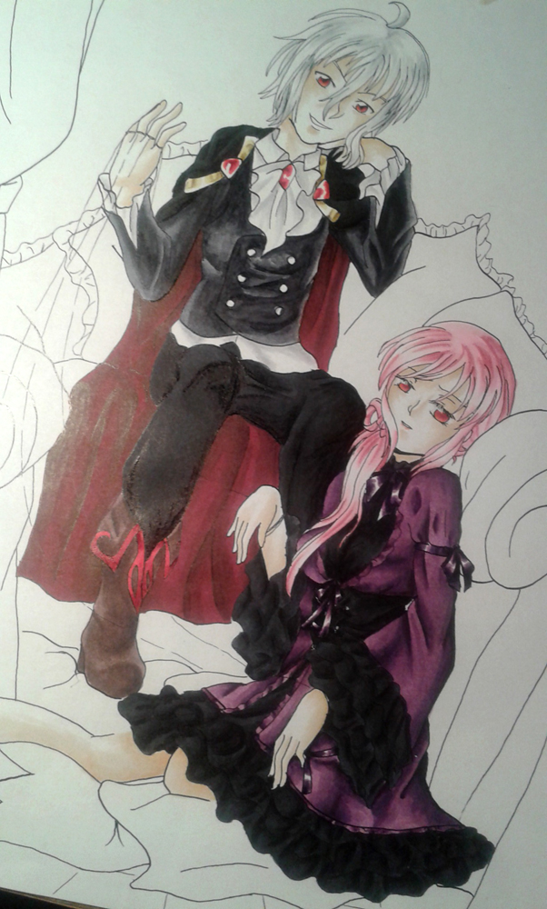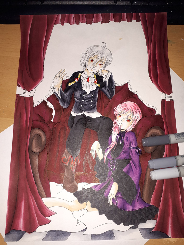 Kommentar des Künstlers, Rhapsody: Die Idee zu diesem Bild kam, als mir der Gedanke total gut gefallen hatte, Amila kurzzeitig zu Emirs Marionette werden zu lassen. Er sitzt hier gemütlich auf einer Couch (ursprünglich war ein Thron geplant haha) und sie liegt vor ihm, zwar auf Kissen, aber dennoch auf dem Boden. Und er hält ihre Fäden in der Hand und lässt sie nach seinem Willen handeln. Es ist mehr ein symbolisches Bild würde ich behaupten, da ich selbst noch nicht weiß, ob und wie dieser Arc in der endgültigen Story dann überhaupt umgesetzt wird. Dennoch mag ich es sehr. Bei der Coloration habe ich zum ersten Mal Marker kombiniert. Das meiste habe ich, wie immer, mit Copic Markern coloriert. Beim Hintergrund hatte ich allerdings eine sehr lange Pause eingelegt, weil ich mir nicht sicher war, wie ich ihn am besten mache. Dann testete ich einmal die Chameleon Pens und war direkt begeistert, sodass ich sie dann zumindest für die Vorhänge verwenden wollte. Generell wollte ich das Bild auch sehr dunkel halten, nicht zuletzt, damit auch die blasse Hautfarbe der beiden Charaktere besser zur Geltung kommt. Bisher definitiv eines meiner liebsten Artworks zu dieser Story. |