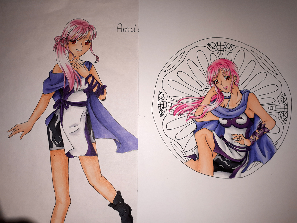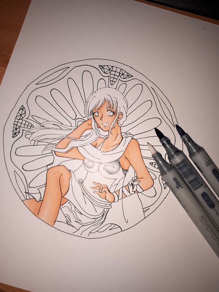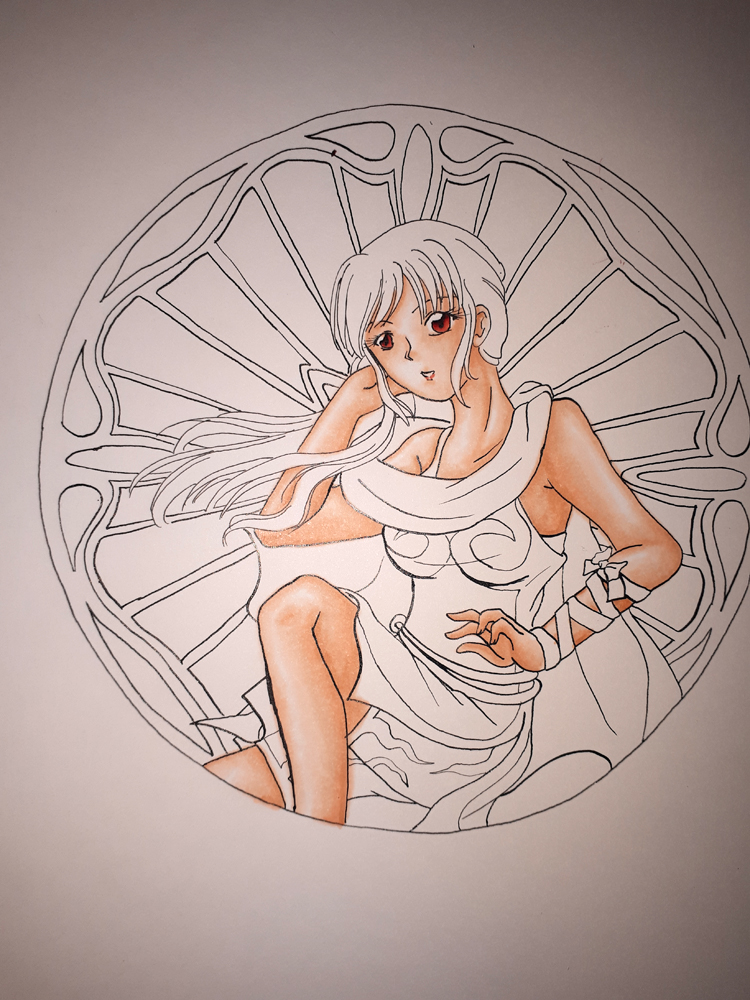 Kommentar des Künstlers, Rhapsody: Ich hatte diese Idee schon seit längerem, wollte aber nicht damit anfangen, da ich durch den Inktober anderweitig beschäftigt war und keine gute Basis für den Hintergrund hinbekommen hatte. Als ich mit dieser dann letztendlich zufrieden war, skizzierte ich zunächst Amila, versuchte verzweifelt sie Lächeln zu lassen, war aber irgendwie nie zufrieden. Nichtsdestotrotz zog ich die Lines zu dem Bild auf meinem neuen Papier, war aber mit diesen gleichermaßen unzufrieden und nutzte es schließlich aus, um die Farben zu testen. Eigentlich war das gar nicht so schlecht, da ich so gleich bemerkte, dass ich meine typischen Farbkombinationen etwas umstellen musste um es ordentlich hinzubekommen. Also wurde die Skizze überarbeitet, der Blick wieder ernster, die Lines erneut gezogen und dann im Stream coloriert. Der Großteil der Coloration erfolgte mit meinen Copics, lediglich das violette des Glasfensters im Hintergrund erfolgte mit meiner ColoreX-Aquarelltusche. Ich muss sagen, das Ergebnis mag ich wirklich sehr gerne und freue mich jetzt schon, den Rest zu dieser Reihe zu zeichnen. |