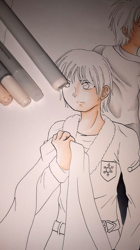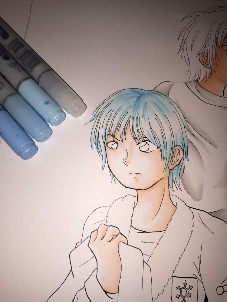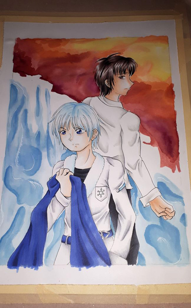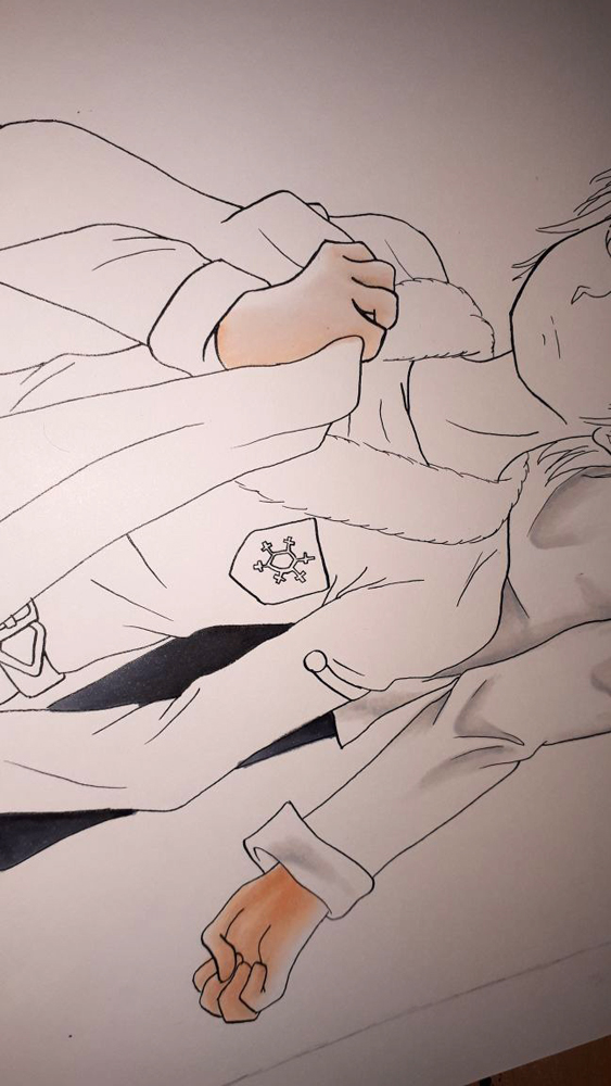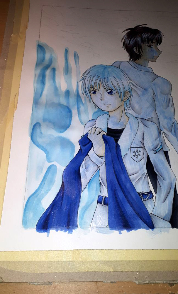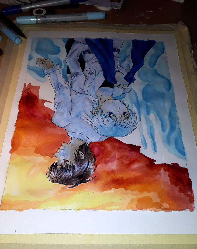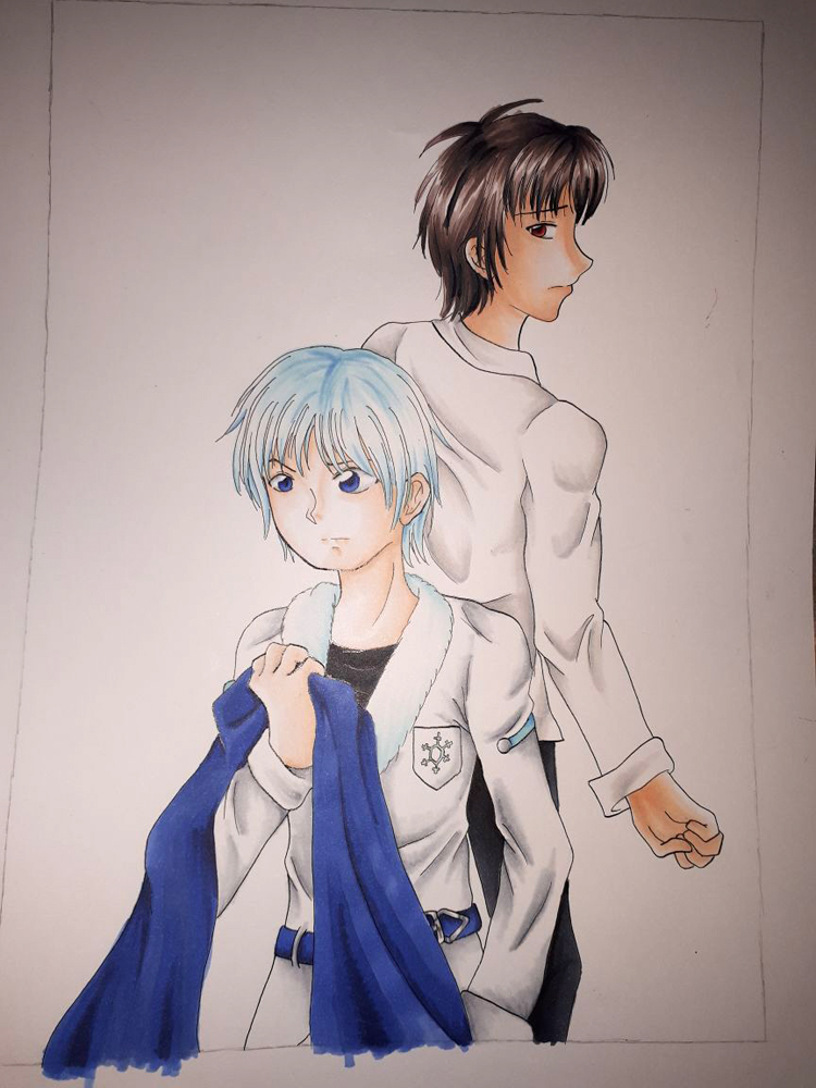 Kommentar des Künstlers, Rhapsody: Das erste Inktober-Remake meinerseits. Nachdem ich Toto darum gebeten hatte, für ihre beiden Jungs aus Staffel 0 die Designs zu individualisieren, wie wir es bei Staffel 1 bereits getan haben, konnte ich nicht anders und musste sie einfach zeichnen. Herausforderung war hierbei vor allem, die passenden Farben für Glenn (blau) zu finden, insbesondere die Haare gaben mir zu denken, da ich sie beim letzten Artwork mit ihm zu dunkel gezeichnet hatte. Am Ende war ich aber unheimlich stolz auf die Coloration und bin echt froh, dass die Farbe so perfekt wurde. Für den Hintergrund habe ich auch hier wieder ColoreX verwendet, auch wenn ich mit dem Eis hinter Glenn persönlich nicht ganz zufrieden bin. |
