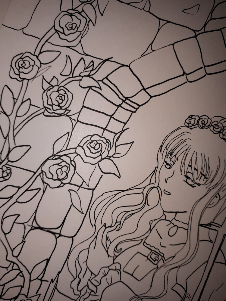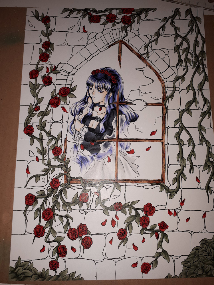 Kommentar des Künstlers, Rhapsody: Die Idee für dieses Bild kam mir ziemlich spontan. Ich hatte einfach eine Eingebung für den Hintergrund, überlegte welcher Charakter sich am besten dafür anbietet und entschied mich schließlich für Nuira - da sie als einzige wirklich gut zu diesem Bild passt. Die Skizze war ziemlich schnell erledigt, weil ich ein gutes Bild vor Augen hatte. Ebenso gingen die Lines relativ zügig. Hier wollte ich dann auch auch Mal etwas aufwendiger werden, also zeichnete ich die Ranken um die Mauer herum. Für den Hintergrund verwendete ich dieses Mal wieder ColoreX, da man mit diesen die Steine einfach wesentlich einfacher colorieren kann, als mit Copics. Und ich muss sagen, ich bin wirklich sehr sehr zufrieden mit dem Ergebnis! |