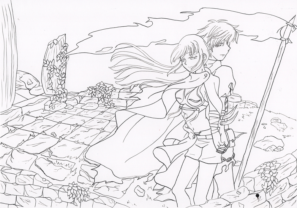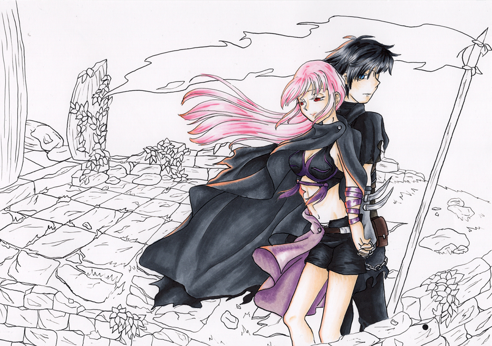 Kommentar des Künstlers, Rhapsody: Dieses Bild hier entstand, als ich das Lied K.haos-Prinz und Wind-Prinzessin von Samsas Traum zum ersten Mal hörte. Ich musste, allein wegen dem Begriff Wind-Prinzessin, sofort an Amila denken. Der K.haos-Prinz passte nach Toris Aussage auch sehr gut zu Damon und so begann ich, die beiden zu zeichnen. Es zeigt ein wenig meine Vorstellung vom 2. Arc zu diesem Zeitpunkt, deshalb die ernsten Gesichtsausdrücke bei beiden. Revolution wird im 2. Arc der Story nur eines der Themen sein, aber ich freue mich schon sehr darauf. Beim Hintergrund überlegte ich sehr lange, entschied mich aber schließlich dafür, eine Ruine zu zeichnen. Eine Ruine, wie man sie im Wind-Reich finden könnte. Beim Himmel hatte ich lange überlegt und entschied mich schließlich, den Sonnenuntergang zu versuchen. Mit Aquarell lässt sich der Himmel so wunderbar colorieren, dass ich einfach Mal die Farben testen wollte hahaha. Persönlich mag ich es sehr gerne, nicht zuletzt auch weil ich die Charaktere wirklich sehr liebe. Und bin unheimlich gespannt darauf, wie ihre Beziehung und alles im zweiten Arc schließlich sein wird. |