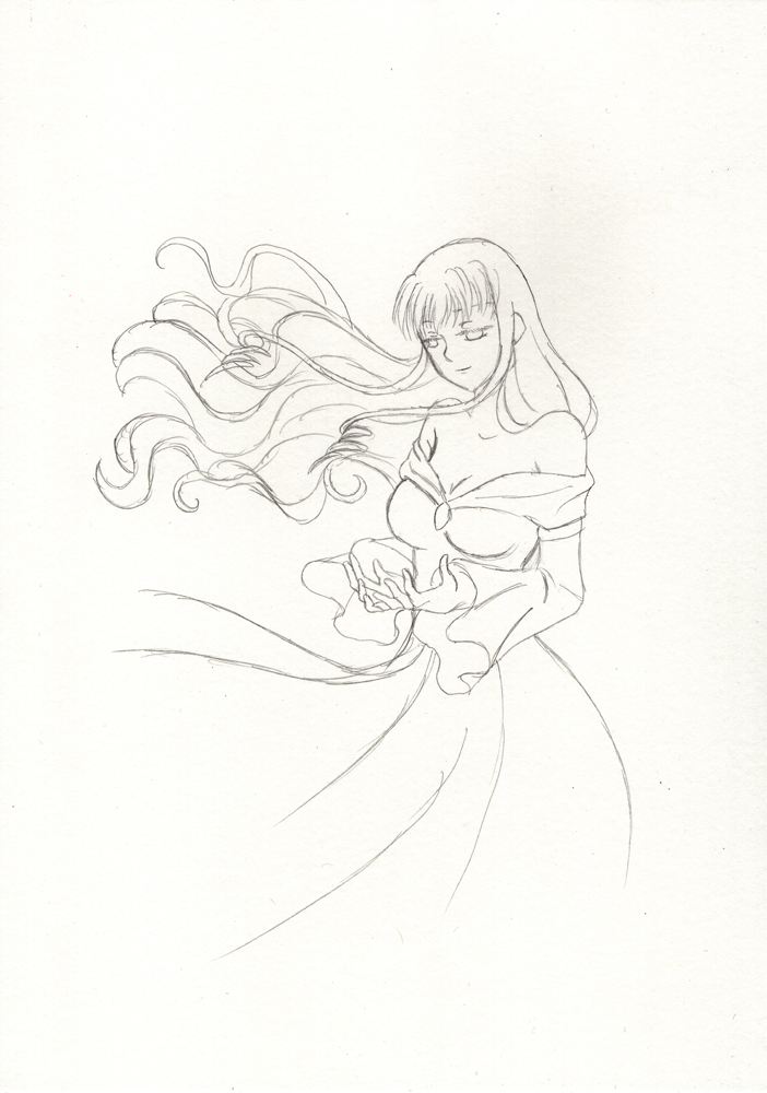 Kommentar des Künstlers, Rhapsody: Nachdem ich viele Bilder zur zweiten Generation von CHG gezeichnet hatte, hatte ich irgendwie Lust, Lumeia Mal wieder ein Bild zu widmen. Nicht zuletzt auch weil ich wissen wollte, sie sie jetzt aussehen würde. Da das Bild sehr "magisch" wirken sollte, entschied ich mich für das Medium Aquarell und zog die Linien später mit Buntstiften nach. Generell habe ich nur wenige verschiedene Farben verwendet, mag das Ergebnis aber generell ganz gerne. |