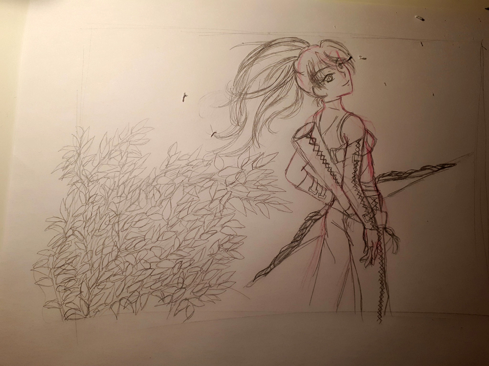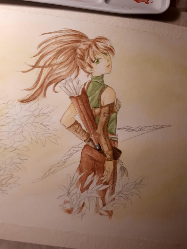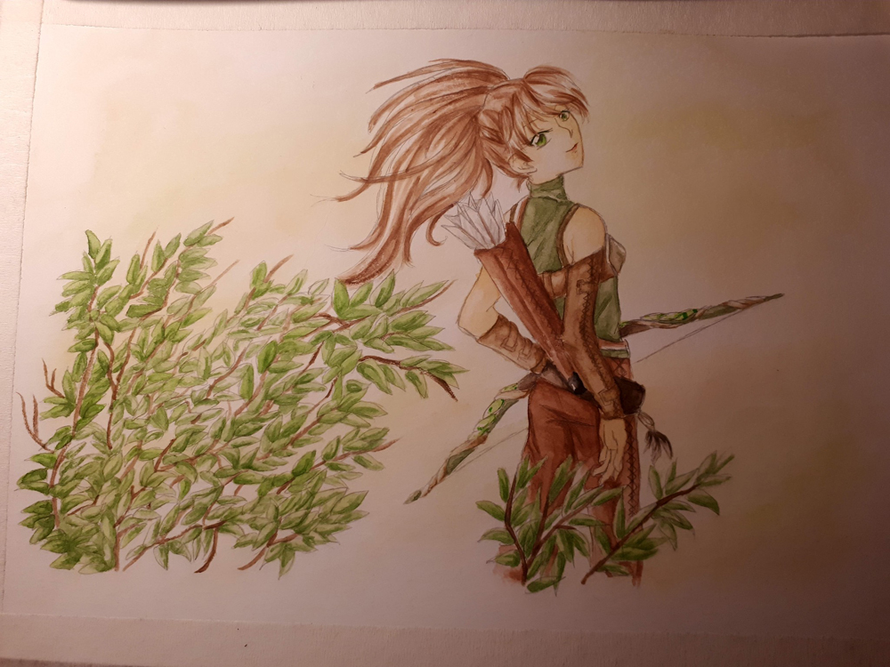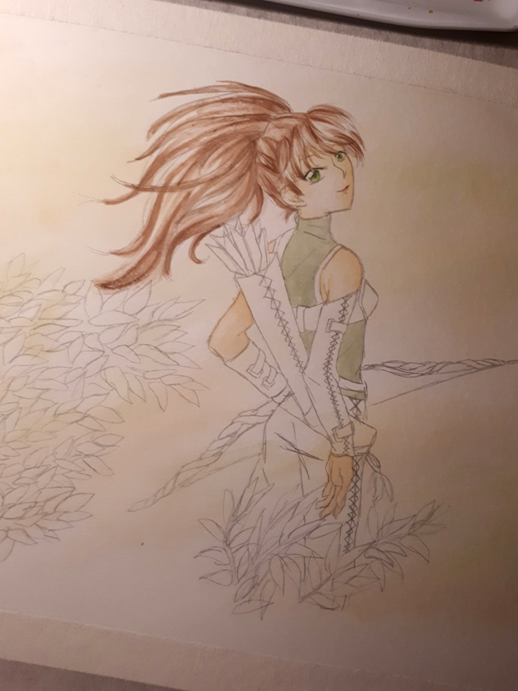 Kommentar des Künstlers, Rhapsody: Auf die Idee für das Bild kam ich, als ich mir das Ending des Anime zu Tales of the Abyss anschaute. Ich wollte unbedingt etwas, in diesem verträumten, leichten Stil zeichnen und bekam dann die Idee für Sheela. Generell ist das Bild bewusst eher einfach gehalten um es nicht zu überladen. Zunächst zeichnete ich die Lines mit Bleistift, anschließend begann ich, das Papier leicht mit Ocker und Grün einzufärben. Erst dann begann ich nach und nach, den Charakter und die Sträucher um sie herum zu colorieren. Persönlich mag ich es wirklich sehr gerne und bin auch, zumindest zum jetzigen Zeitpunkt, sehr stolz auf die Coloration. Endlich hat unsere Erd-Prinzessin aus Staffel 0 von Central Hell Goddess auch ein Solo-Artwork! |