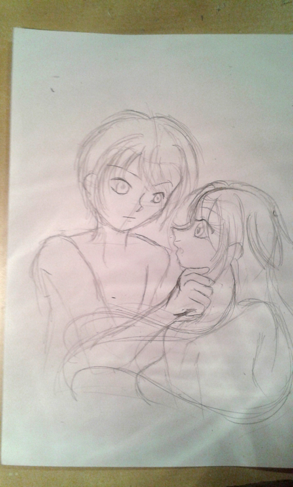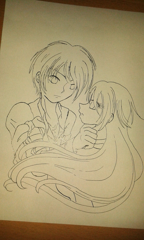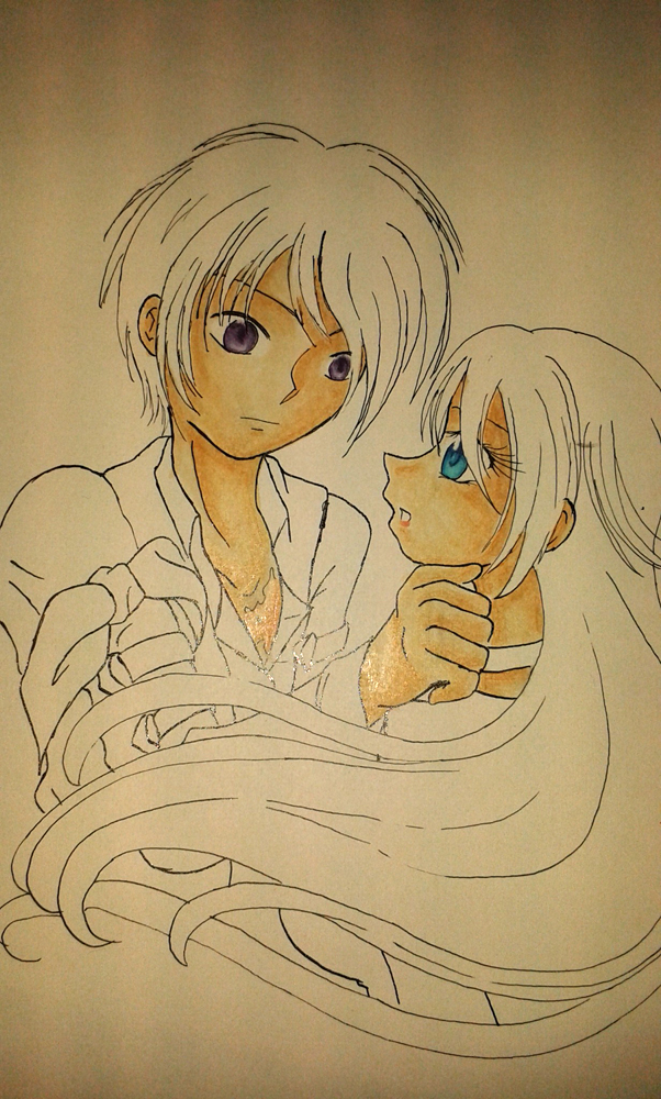 Meine liebe Freundin Tori hatte mich mit unserer Pokémon Fanstory "Kaimetsu Suru no Kanren" angesteckt. Und so begannen wir mit unserer dritten oder vierten Neuauflage unserer Kanto-Story zu dieser Serie. Wir beide mochten unsere Hauptcharaktere Kuro (links) und Shiro (rechts) schon immer unheimlich gerne, vor allem auch deren Geschichte, sodass es für uns wirklich ein leichtes war rein zu kommen. Die Story war schnell noch einmal überarbeitet und mit ihr auch die Geschichte der Beiden. So gesehen kann man sagen, dass sie in gewisser Weise Gijinkas von Mewtu (Kuro) und Mew (Shiro) sind haha.Aber nur in gewisser Weise. Dieses Bild spielt noch zu der Zeit, als Kuro selbst ein Crypto-"Pokémon" ist, sein Herz und mit ihm auch seine Gefühle und Erinnerungen versiegelt sind. Es kam eigentlich vollkommen spontan, dass ich das Bild zeichnete. Wir hatten uns über die Story unterhalten, Tori hatte Shiro designed und ich gerade am Tag zuvor eine Skizze von Kuro angefertigt. Und während wir uns unseren Spinnereien hingaben stieg in mir die Lust auf, unser Traumpaar zu zeichnen. Ziemlich schnell kam dann auch die Idee für dieses Bild und am selben Abend entstand die Skizze. Ich muss sagen dass ich auch wirklich sehr sehr viel Spaß am zeichnen hatte. Es ist jetzt nichts großes oder aufwendiges, aber hier steckt dennoch sehr viel Liebe drin, wodurch es jetzt schon zu einem meiner liebsten Fanarts wurde. |