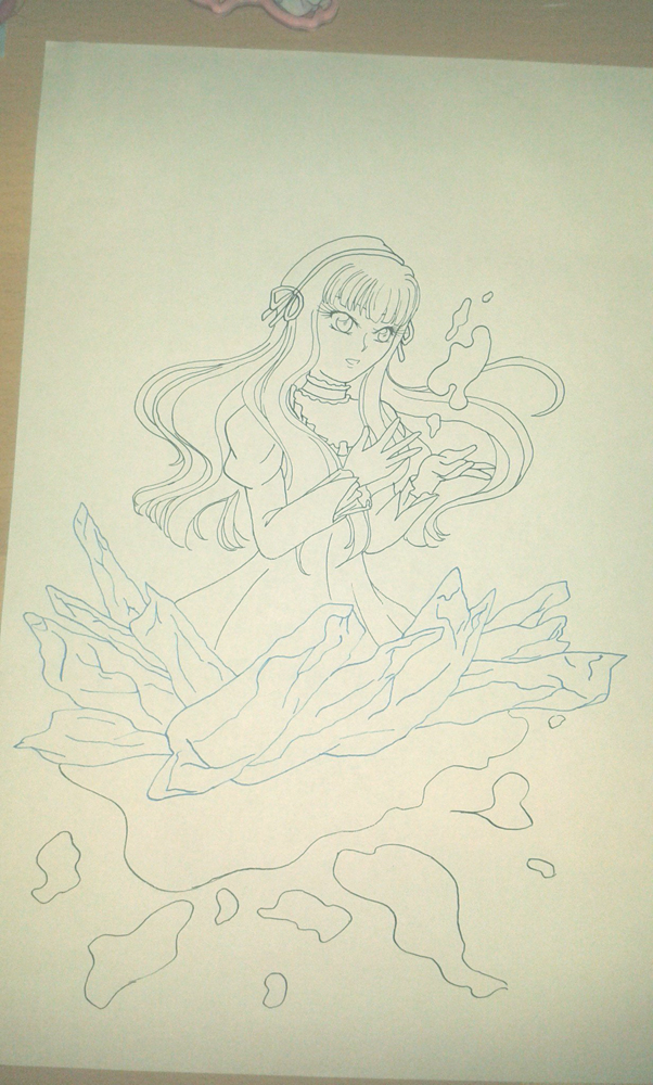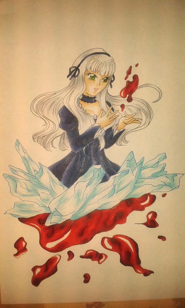 Dieses Bild entstand nach einem Rewatch des Anime Sousei no Aquarion, einer meiner großen Favoriten. Gerade bei diesem Rewatch begann ich auf einmal, Rena total ins Herz zu schließen und wollte sie anschließend unbedingt zeichnen. Vor allem angetan hatte es mir die Episode, in der behauptet wurde, sie sei ein Vampir. Aus diesem Grunde fügte ich das ganze Blut zu dem Bild hinzu, einfach um das zu unterstreichen. Die Kristalle hatte ich von einem Bild von Apollonius und Celiane übernommen und empfand es als durchaus passend. Der Hintergrund sollte eigentlich blasser werden, als ich aber angefangen hatte zu sprühen, ging es einfach mit mir durch haha. Wo ich mir auch nicht sicher bin, ist ob man wirklich erkennt, dass sie eigentlich blind ist. In der Serie selbst bekommt man das leider auch nur am Anfang wirklich vermittelt, was ich ein wenig schade finde. Dennoch, ihr Design und ihre Art sind einfach Liebe. |
