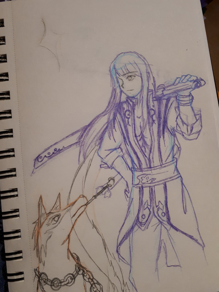 Nachdem ich Yuri skizziert hatte, kam mir die Idee, dass sein Hund Repede noch sehr gut dazu passen würde, zumal die Beiden ohnehin fast unzertrennbar sind. Er war tatsächlich eine größere Herausforderung als Yuri selbst, weshalb ich ihn am Ende fast mehr abgezeichnet hatte. Beim nächsten Mal wird es anders ablaufen haha.