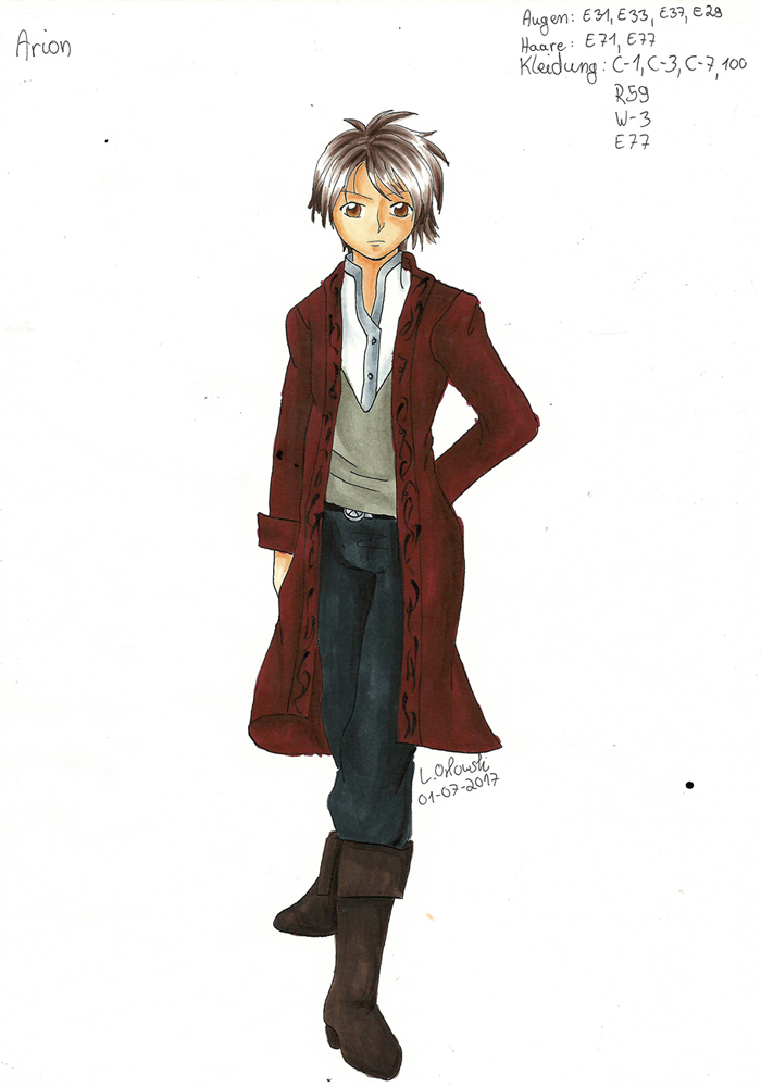 Diese Kleidung trägt Arion, während er durch die Länder reist und Aufträge als Söldner sammelt. In wärmeren Gebieten legt er den Mantel auch einmal ab, um nicht darin einzugehen. |