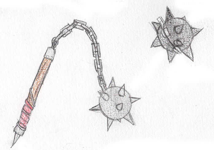 Arion kämpft zwar mit verschiedenen Waffen, nutzt aber vorwiegend seinen Morgenstern. Solange er ihn nicht benötigt, wird er sicher in einem Lederbeutel verwart. |