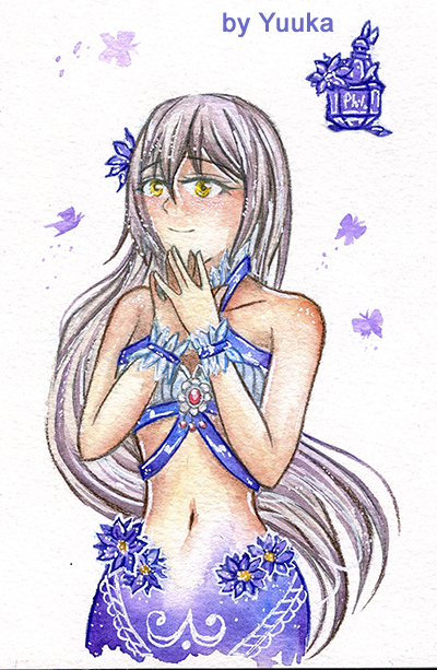 Für die weitere Zutat, musste er schon einiges Riskieren. Nur Tags über konnte er wunderschöne Blumen an Stränden aus dem Wasser sehen. Dabei nicht entdeckt zu werden war fast unmöglich. Aber nach einiger Zeit und noch viel mehr Geduld, fand er eine Blume, ein Rittersporn, seine tief Violette Farbe faszinierte ihn und blieb ihm immer im Kopf. So das er eines Nachts versuchte mit vielen Sprüngen aus dem Wasser an eine Blüte heran zukommen welche an einem Abhang über dem Wasser hing. Verletzt, mit Schrammen und Schnitten legte er aber ein Blütenblatt glücklich als erste Zutat in sein geliebtes Flacon. Die Wunden störten ihn nicht weiter, ihm war es jede Anstrengung wert.