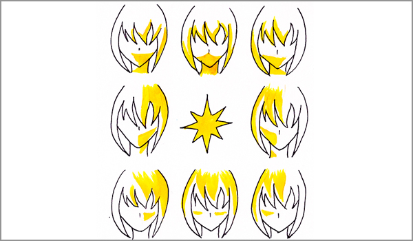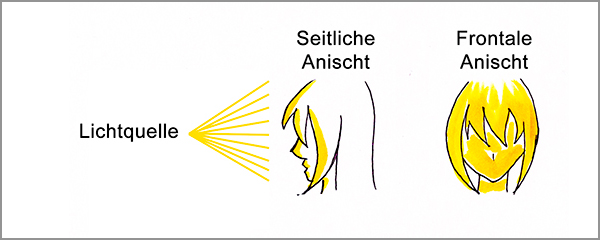 In diesem Beispielt habt ihr also eine Frontale Beleuchtung. Das heißt der Pony wird beleuchtet, der Hinterkopf aber nicht! Weil diese im Schatten des restlichen Kopfes liegen würden.